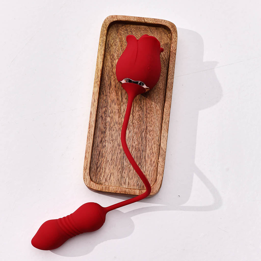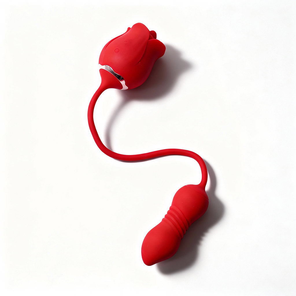 Rose is a clit vibrator that offers not only external stimulation, but internal as well through the thrusting egg vibrator connected via a silicone cord. While your clitoris gets some love, the thrusting vibrator will give your g-spot the attention it needs. With a variety of exciting speeds and modes, this vibe will make you go numb from pleasure. The vibrating and thrusting functions are independently controlled, but are able to be used simultaneously.